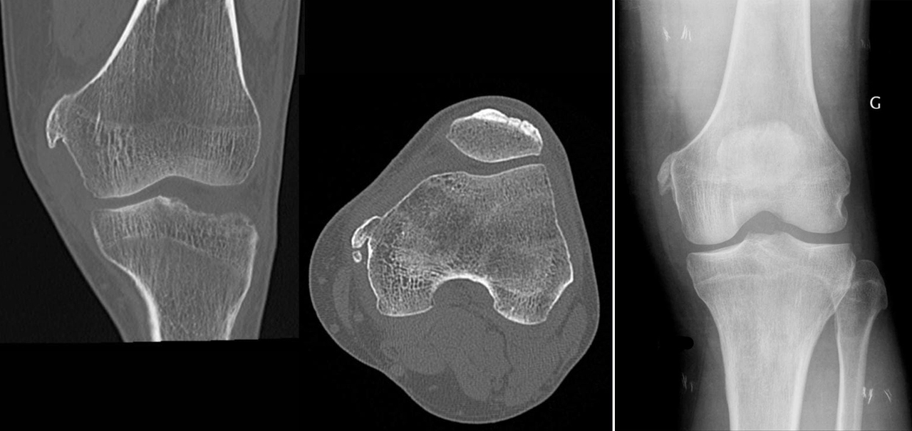Une radiographie standard du genou gauche, complétée par une tomodensitométrie, est réalisée.
