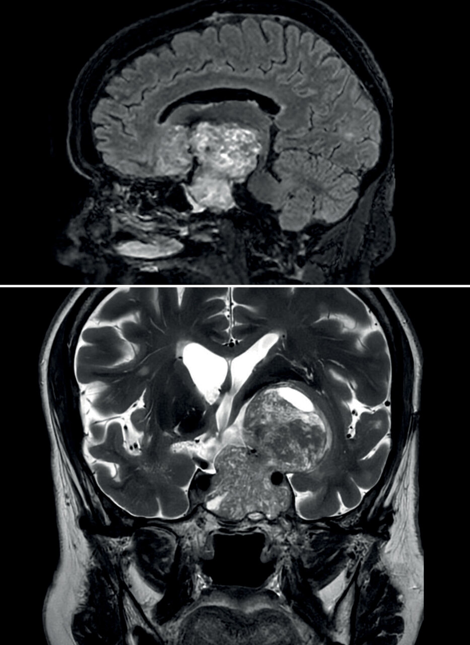 L’IRM met en évidence un macroadénome hypophysaire élargissant la selle turcique et présentant une extension extrasellaire intracrânienne. Une exérèse est réalisée par voie frontotemporale. En post-opératoire, la patiente développe une insuffisance gonadotrope corticotrope et thyréotrope secondaire.
