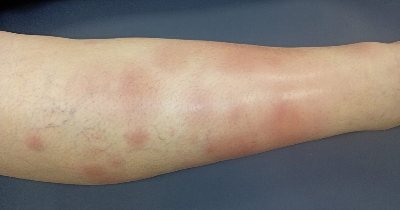 Une patiente de 32 ans consulte pour l’apparition depuis une semaine de nodules douloureux aux faces antérieures des jambes. Les lésions sont apparues progressivement, associées à une fébricule, une asthénie et des arthralgies des chevilles. L’examen montre des nodules érythémateux, chauds, fermes et douloureux à la palpation de 2 à 5 cm, bilatéraux et symétriques, avec des limites mal définies, sans ulcération ni suppuration, localisés dans les régions prétibiales. L’état général est conservé.