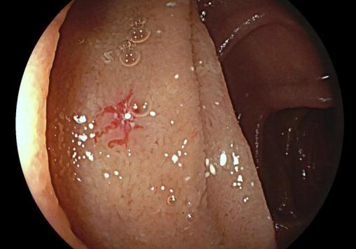 Aspect typique d'une angiodysplasie digestive duodénale : lésion rouge vif, ronde, petite (inférieurs à 10 mm de diamètre), plane (ou légèrement surélevée) et aux contours irréguliers mais nets.