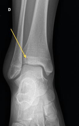 La fracture de Tillaux touche préférentiellement les adolescentes en fin de croissance, avec une atteinte de l’extrémité distale et latérale de l’épiphyse tibiale. Ici, fracture chez une jeune fille de 13 ans.