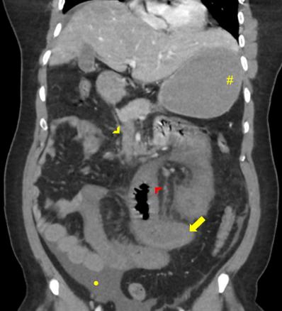 Pointe jaune : thrombose de la veine mésentérique supérieure ;