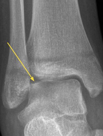 Lésion ostéochondrale du dôme talien avec un défect au coin supéro-externe. Extrait de : Entorse de cheville de l’enfant