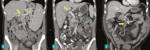 A. Cavernome porte sur thrombose de la veine porte (TVP) sans hépatopathie sous-jacente (# : splénomégalie ; flèche jaune : thrombose porte ; pointe jaune : varices porto-cave ; pointe rouge : cavernome).