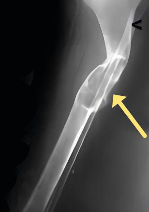 Image radiologique de tumeur brune. Lésion ostéolytique soufflante pouvant entraîner une fracture pathologique.