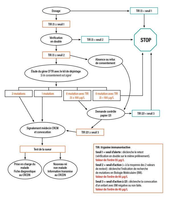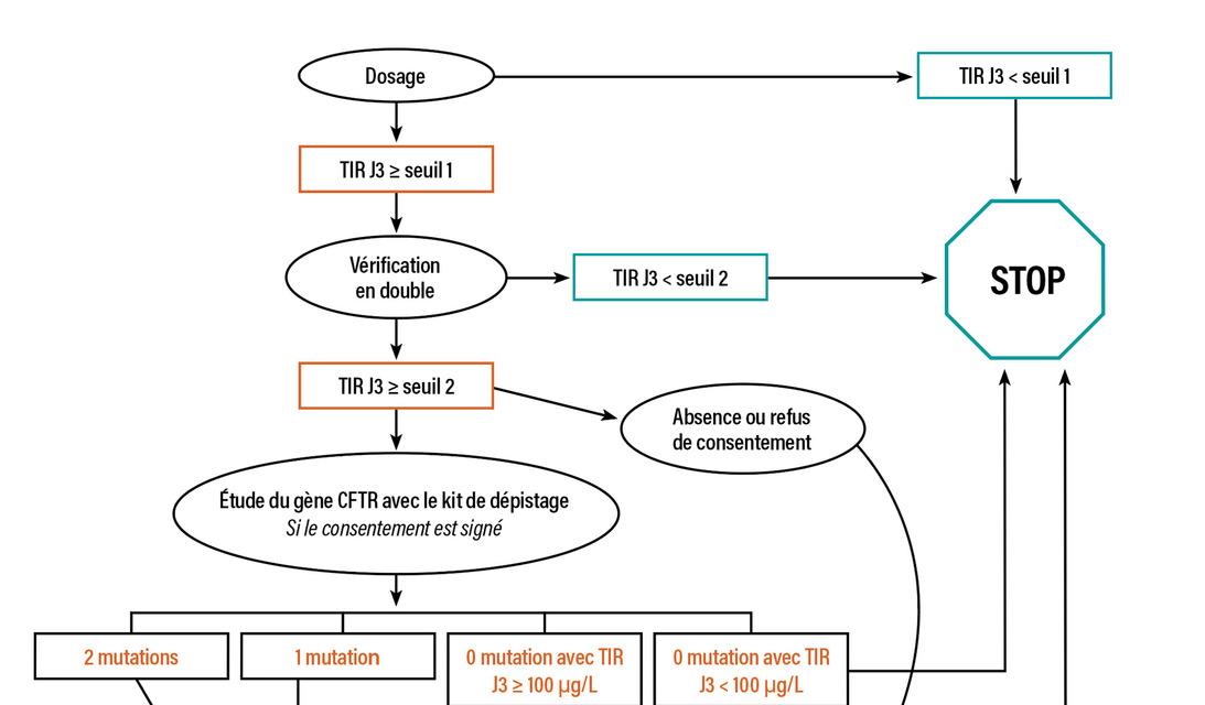 Figure 2. Extrait de : Dépistage néonatal de la mucoviscidose Lire aussi DossierUn bouleversement thérapeutique ArticlePerspectives de traitement pour les patients non éligibles aux thérapies protéiques de la mucoviscidose ArticleMucoviscidose : les 10 messages clés ArticleComment les patients vivent-ils le changement de paradigme thérapeutique dans la mucoviscidose ? ArticleImpact pronostique des nouveaux traitements de la mucoviscidose ArticleConseil génétique dans la mucoviscidose : que dire aux familles ?